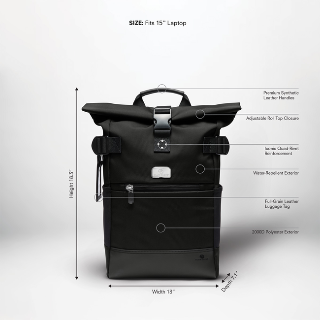 Modern design meets elevated touchpoints. The Pro Roll Top is a compact and versatile roll top backpack for everyday use, engineered with a lightweight, high-performance 2000D Polyester exterior for durability and style. Store your laptop in a dedicated velour-lined sleeve, and buckle up for any adventure.