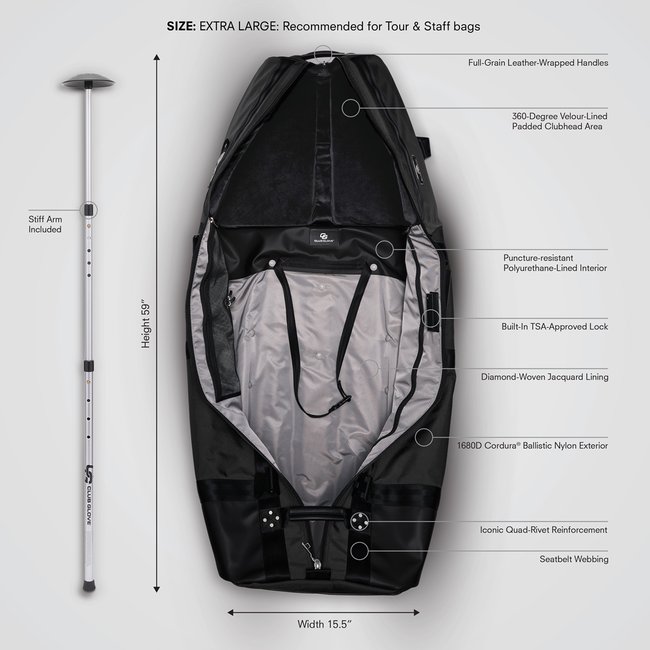 The Tour Traveler, the #1 Golf Travel Bag on Tour, is the trusted choice of professional golfers worldwide to protect their equipment. Recognized by industry experts as the best golf travel bag, it’s crafted from premium materials for unmatched protection and durability, with features designed to provide a secure and elevated travel experience. The Tour Traveler is designed for maximum storage, ideal for Tour or Staff golf bags. For a smaller, more compact stand bag version of this ultra-premium golf travel bag,, explore the Tour Traveler SB.
