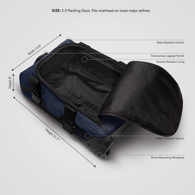 Lightweight and durable, with essential storage, the Mini Rolling Duffle is perfect for a weekend golf getaway—sized to meet the maximum allowable carry-on dimensions on nearly all airlines. With a lightly-structured, modern wheeled-duffle design, pack efficiently in this travel duffle and keep your belongings protected with a shock-absorbing wheelbase. Roll on and roll off with everything you need.